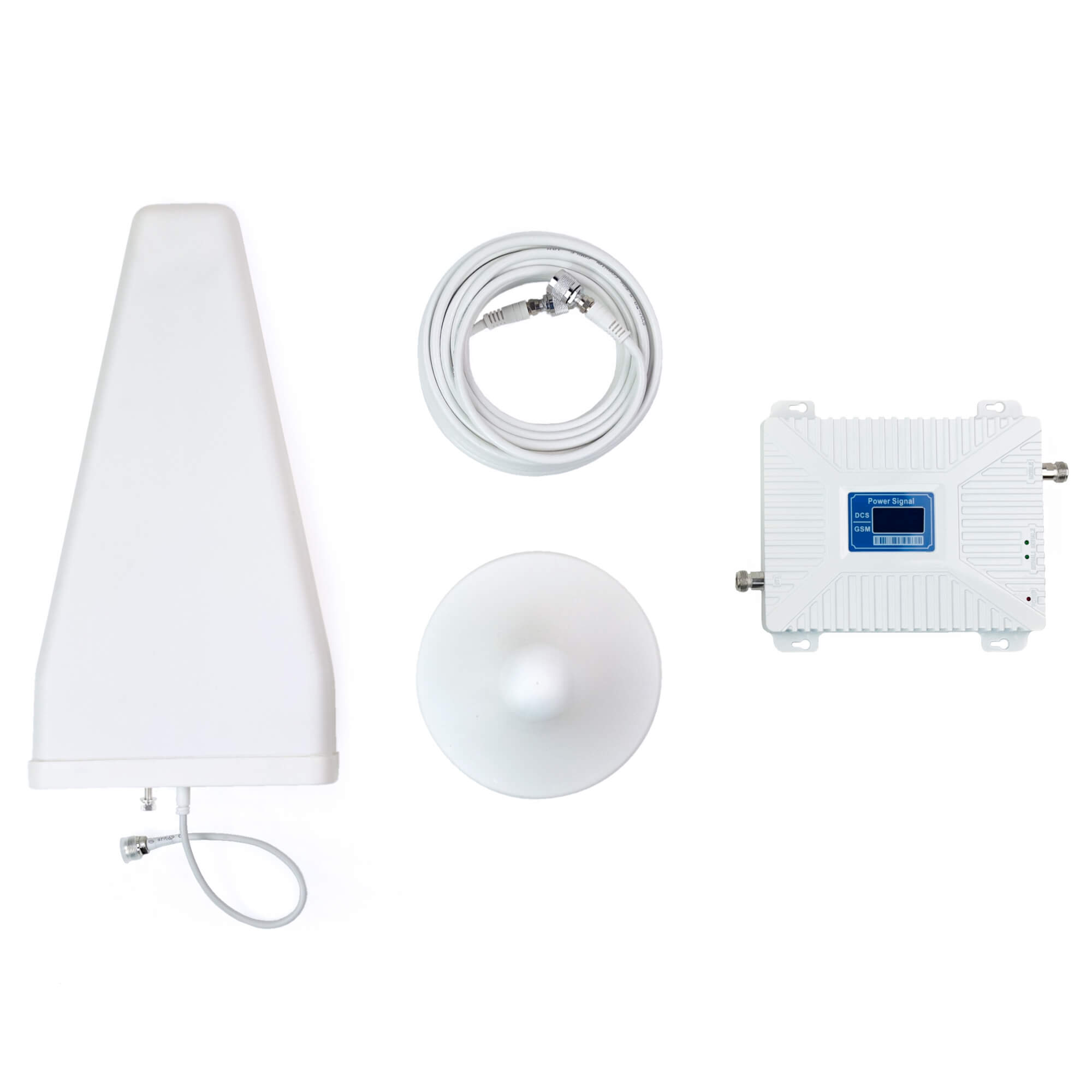 Комплект усилителя сигналов сотовой связи стандартов 2G, 3G и 4G. Помимо блока усиления в белом металлическом корпусе с небольшим ЖК дисплеем, в комплекте уличная направленная антенна и комнатная антенна круговой направленности. Обе антенны помещены в пластиковые футляры дли создания эстетичного внешнего вида и защиты от атмосферных влияний. В комплекте так же соединительный коаксиальный кабель, адаптер питания для блока усиления, металлический крепеж для антенн. Общий коэффициент усиления комплекта не менее 70 dbi.